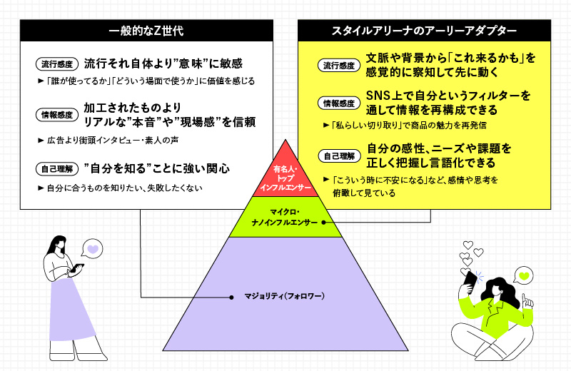 リアルな共感を生む彼らは“真似される側”の存在であり、その価値観は新商品の初期評価や市場トレンド形成に大きな影響を与えています。