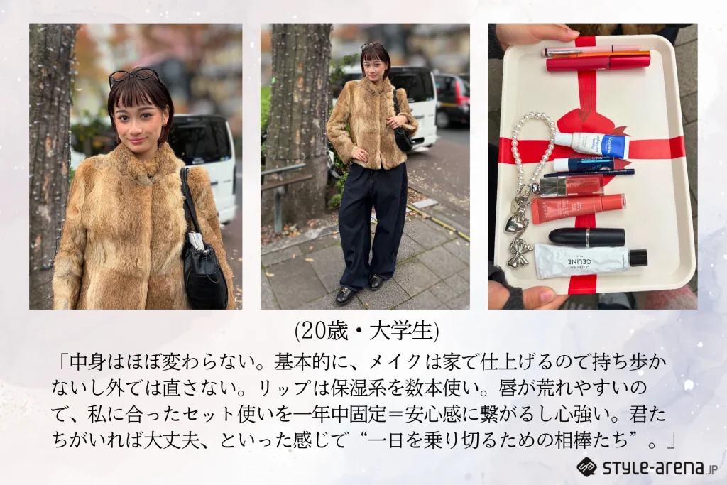 また、25歳・美容師の人は、ポーチの構成は毎日同じで、変わるのはリップの色味だけ。全アイテムを毎日使うわけではないが、「この一式が入っているだけで安心」と語り、“私にはこれ”というマイルールがあることが伺えました。
