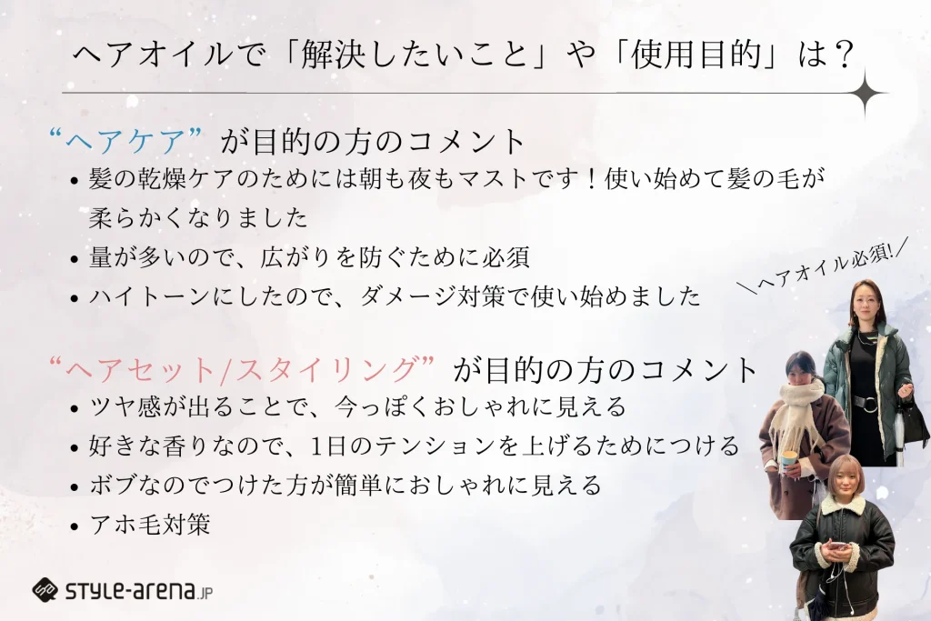 ヘアオイルの使用目的は「乾燥・ダメージケア」と「おしゃれっぽさ」