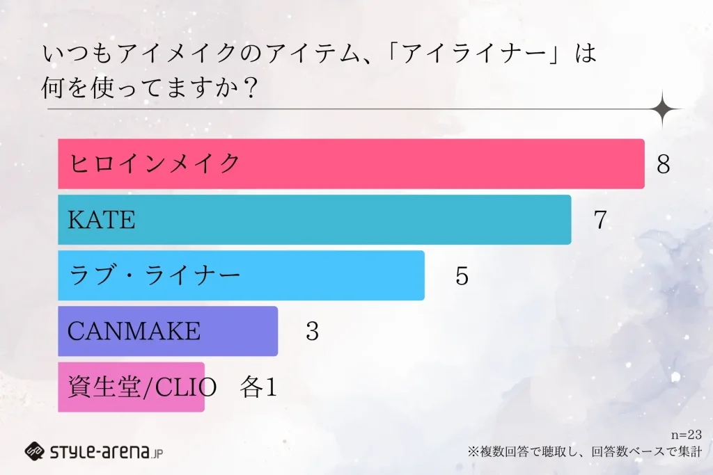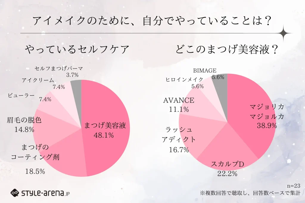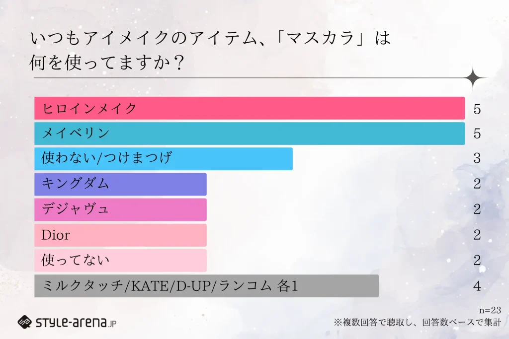まつげの地盤を整えるためのまつげ美容液という答えが多く、23人中13人が使用していました。メーカーはマジョリカマジョルカ、スカルプDといったドラッグストアで購入できて、“続けやすい価格帯”層と、ラッシュアディクトなどの高価格アイテムを選ぶ“効果に投資”層に分かれますが、まつげケアとして定着しているようです。