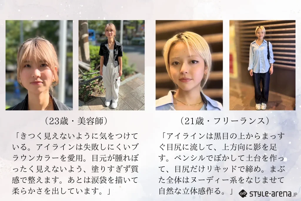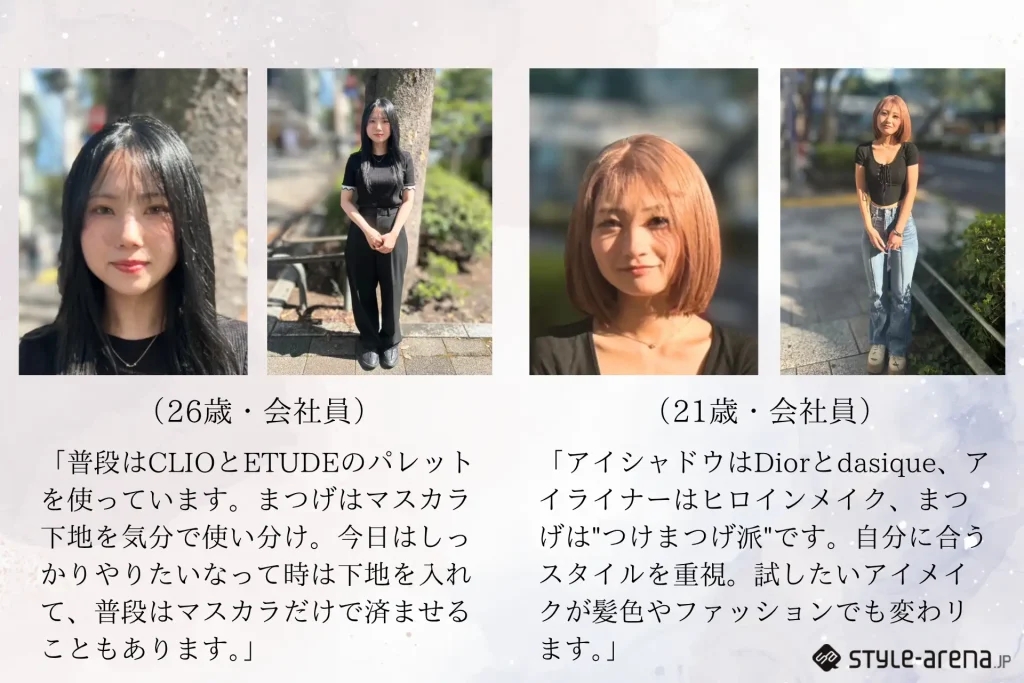 彼女たちは「ナチュラルに見せたい」という一方で、アイメイクの土台を日頃から補強し、マスカラの下地や影を使い分け、ラメやマットの質感調整で立体的に仕上げ、自然に盛れる最大限、日常に溶け込むアイメイクを作っています。