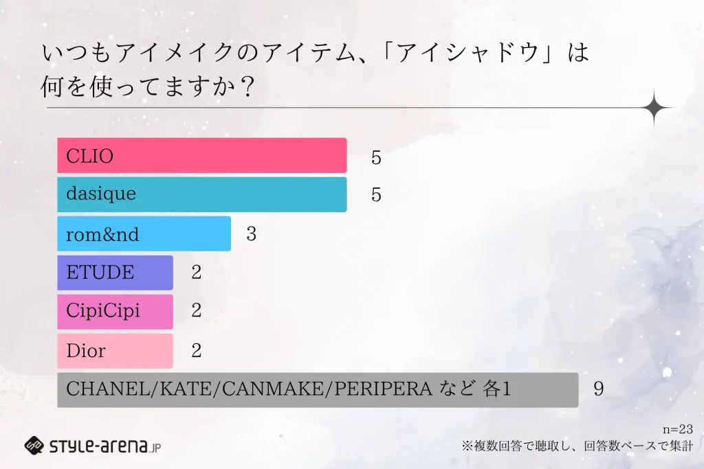 アイシャドウはCLIO、dasique、rom&ndなどの韓国勢が強く、人気はパレットのカラーが豊富に入ったもの。ポイントでDiorやCANMAKEなどデパコス、もしくはドラコスを差し込む使い分け派もみられました。アイライナーはヒロインメイクとKATEが二強。マスカラは、ヒロインメイクとメイベリンの指名買い。また、まつげの仕込みとしてマスカラ下地を併用する人も多く、長さを補強するKATE、ボリュームアップ目的のDiorを使い分ける人も。