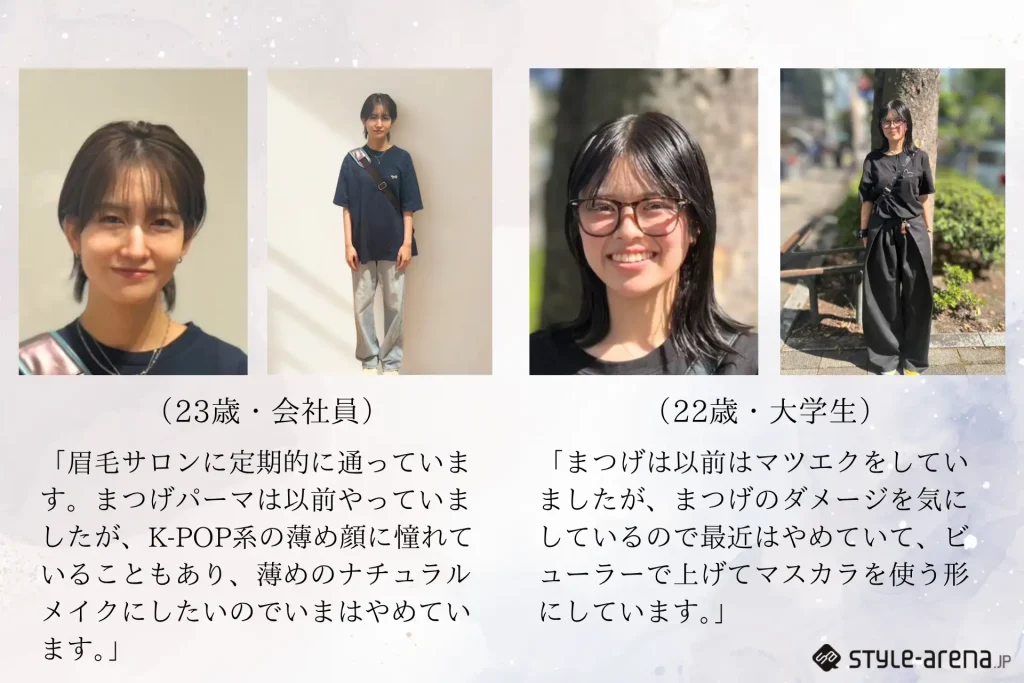 「自まつげを強化していきたい。美容液は決まったブランドではなく、いろいろ試しています。今、使っているものは伸びを実感できますが、もっと太さや強さが欲しいと思っていて、新たなアイテムを探しています。」(右の協力者の深掘りコメント:22歳・大学生)