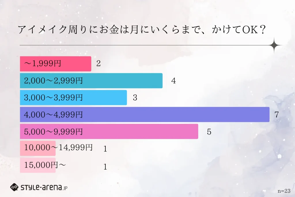 では「アイメイク周りにお金は月にいくらまで、かけてOK?」と質問したところ、普段は少額、必要な月だけ上げる人が中心でした。最頻値は¥4,000〜¥4,999。まつげパーマやマツエクに行く月は¥10,000前後まで一時的に上がり、常時高投資は少数派でした。